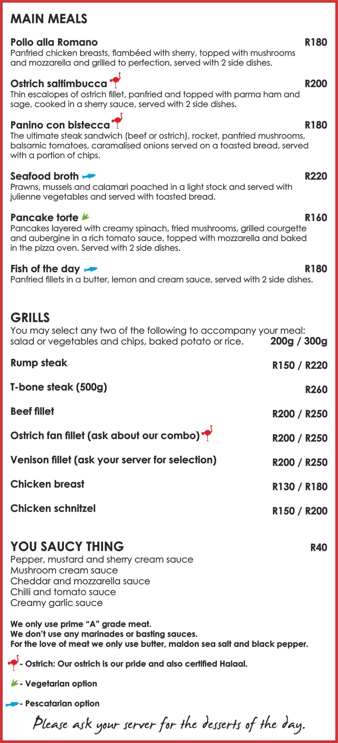 Thin escalopes of ostrich fillet, panfried and topped with parma ham and sage, served with verjuice and sherry sauce, served with 2 side dishes.